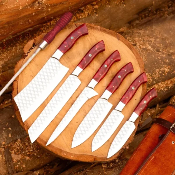 HAND FORGED Handmade carbon steel 5 pieces chef set with resin wood handle and leather case. kitchen knives